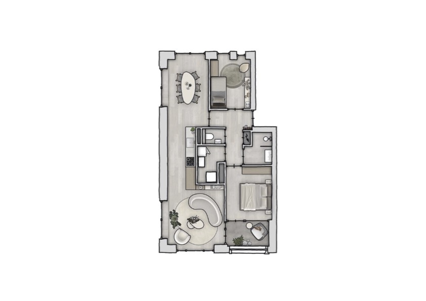 De architectuur van dit appartementencomplex is geïnspireerd op klassiek Kralingen, met warme baksteen, verfijnde detaillering en grote raampartijen. De zitkamer is gesitueerd aan de Avenue-zijde en vormt een lichte en uitnodigende leefruimte met grote ramen en toegang tot het inpandige balkon op het zuiden (ca. 4 m²). Hier geniet je in alle rust van de zon en het uitzicht op de groene laan.