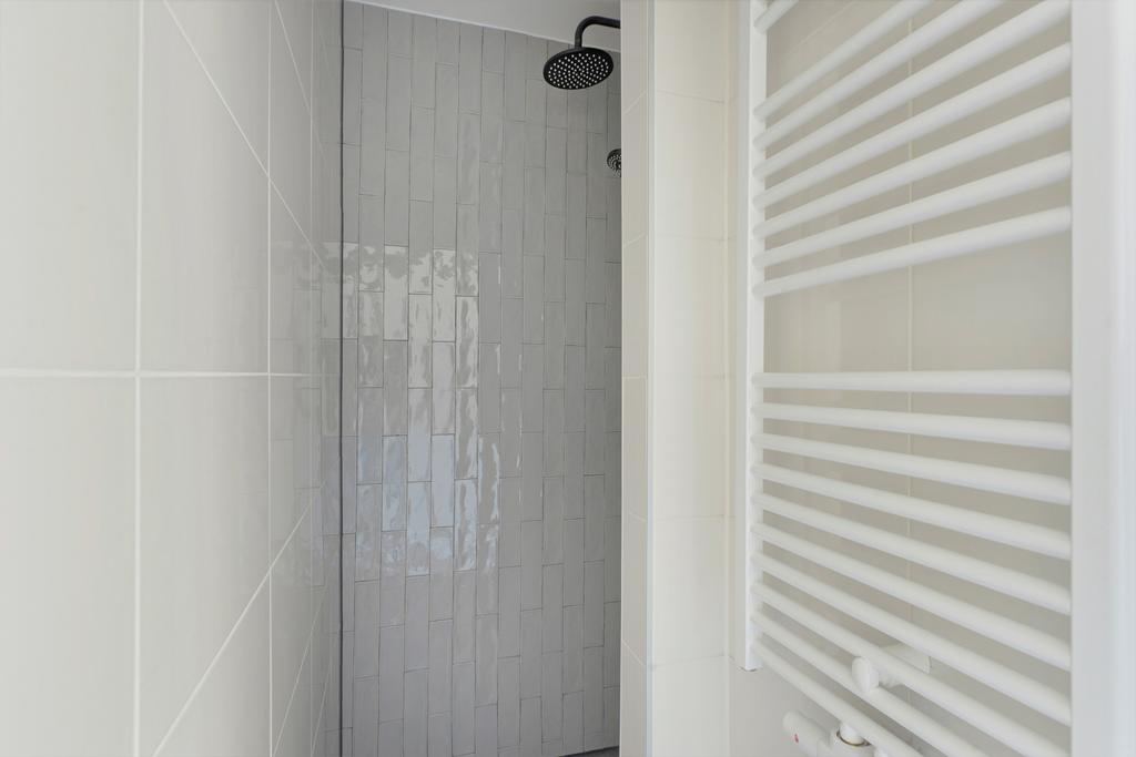 De moderne badkamer is voorzien van een ruime inloopdouche. Het separate toilet is uitgevoerd met een Geberit zwevend toilet en fonteinset.