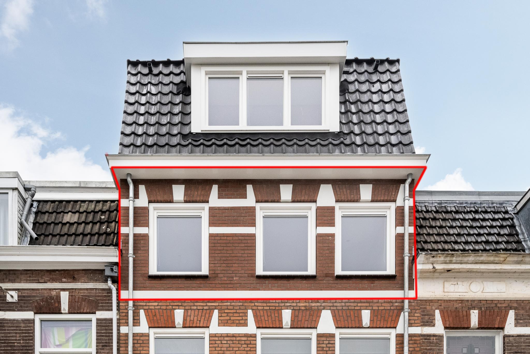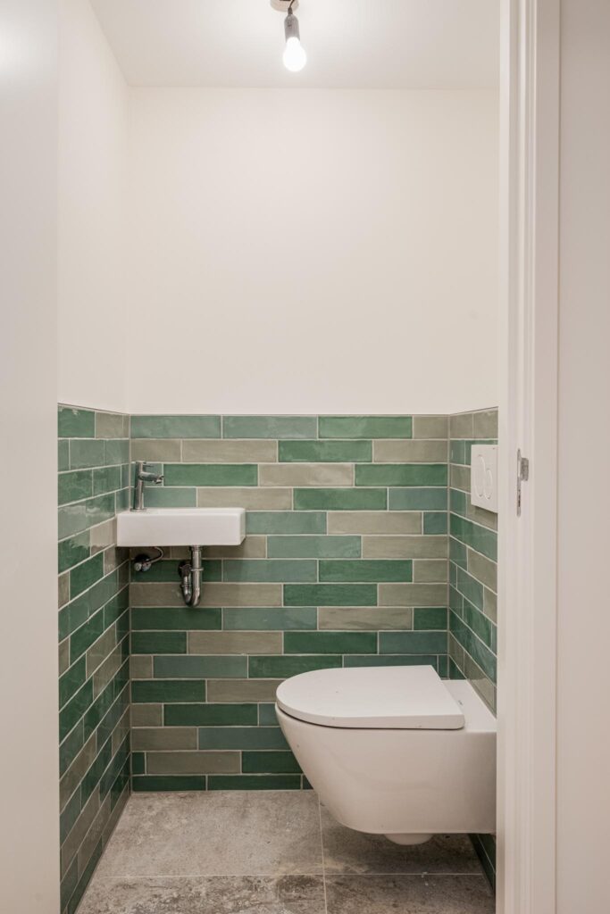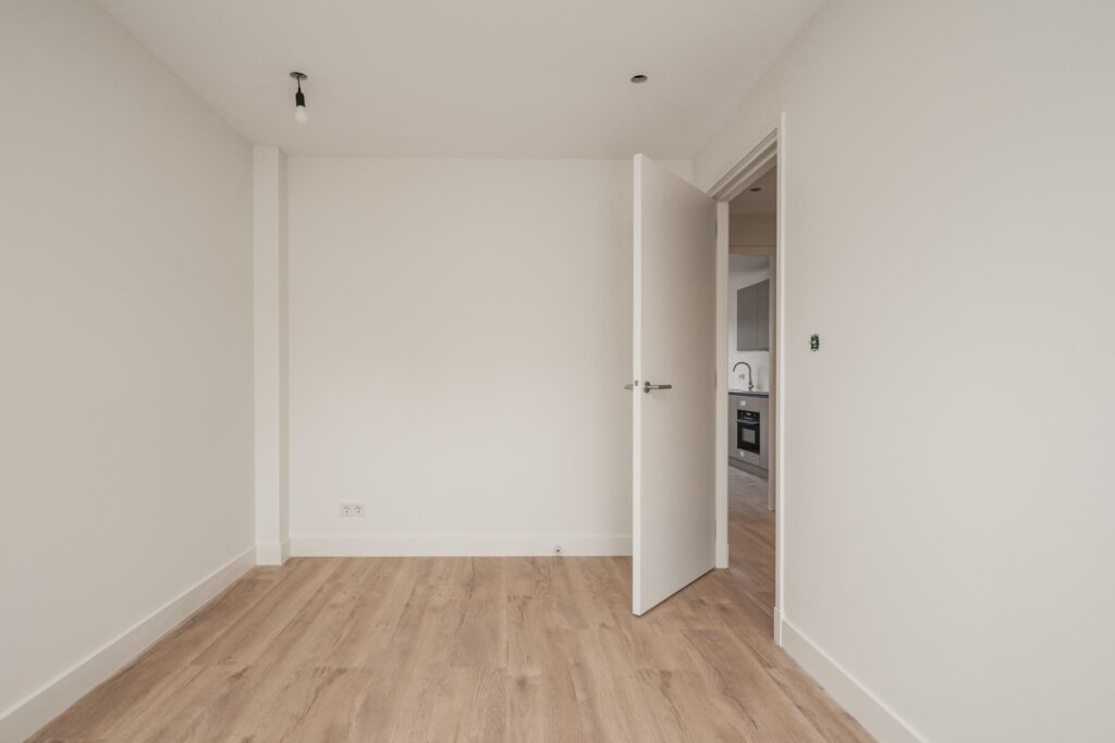 Tweede verdieping: gemeenschappelijke overloop, entree, gang, deur naar technische ruimte (groepenkast en zonneboiler), toilet, badkamer met inloopdouche, wastafel en ruimte voor wasmachine/drogeraansluiting, deur naar heerlijke lichte woonkamer met grote ramen aan de voorzijde en open keuken met combi oven, vaatwasser en elektrische kookplaat, lichte slaapkamer met zonnig dakterras op het westen. Het appartement is voorzien van gordijnen en verlichting.