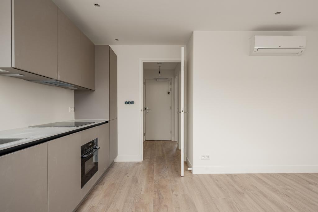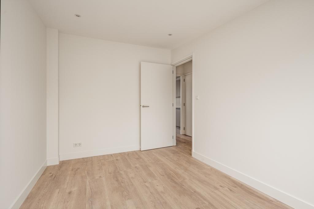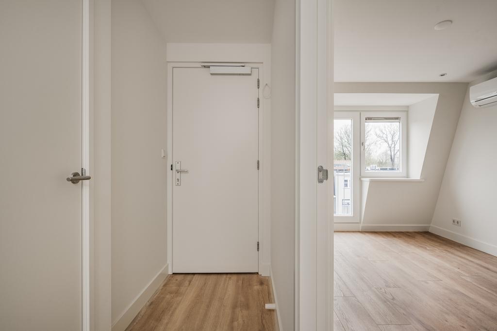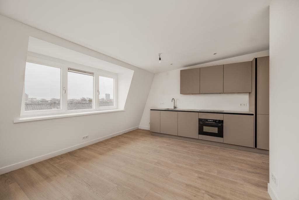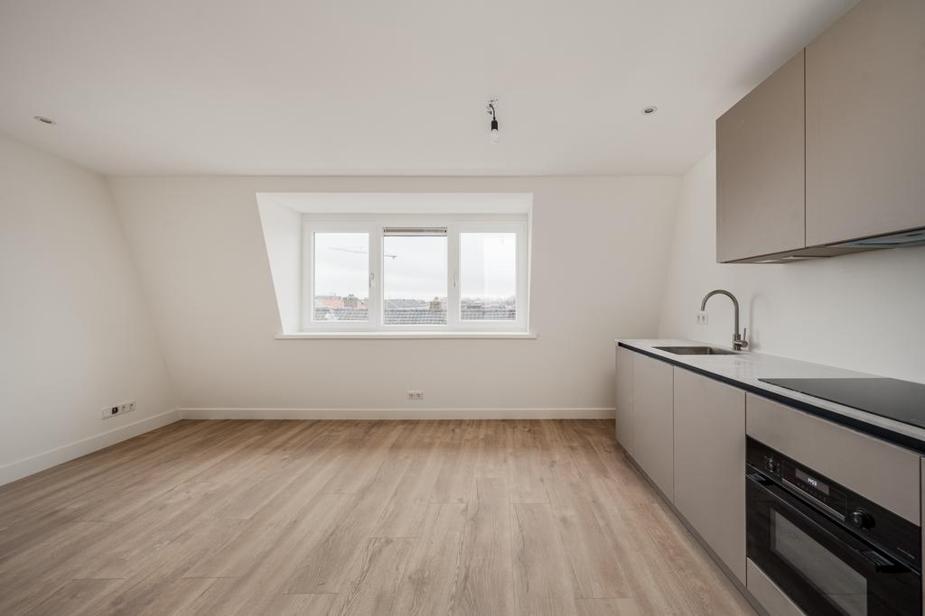 Derde verdieping: , gang, deur naar technische ruimte (groepenkast en zonneboiler), toilet, badkamer met inloopdouche, wastafel en ruimte voor wasmachine/drogeraansluiting, deur naar heerlijke lichte woonkamer aan de voorzijde en open keuken met combi oven, vaatwasser en elektrische kookplaat, lichte slaapkamer aan achterzijde. Het appartement is voorzien van gordijnen en verlichting.
