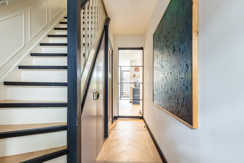 Parterre: entree, hal, gang met trapkast en toilet met fonteintje, zeer ruime uitgebouwde woonkamer met open keuken (2021) voorzien van koel/vriescombinatie, vaatwasser, stoomoven, inductie kookplaat met afzuiging, Quooker en koffiecorner. Uitbouw met lichtstraat en vaste bank.