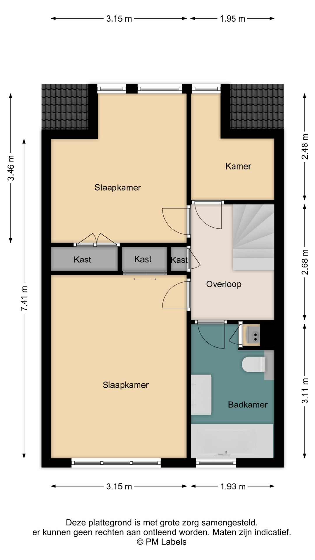 1e Etage: overloop, 2 ruime slaapkamers en zijkamer thans in gebruik als werkkamer, badkamer met bad, dubbele wastafel en toilet.
